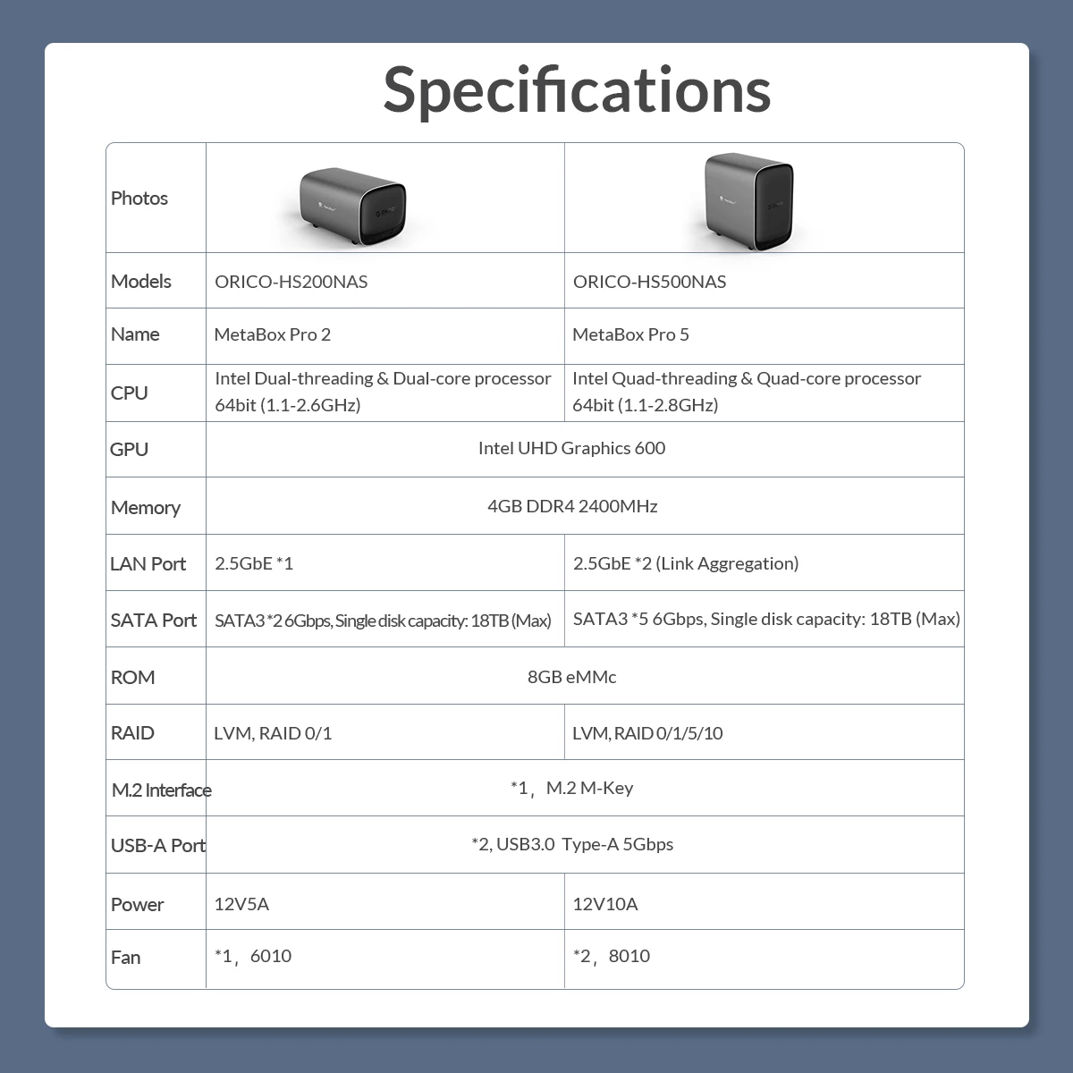 HS500NAS is an advanced family private cloud NAS, with a five-bay architecture design, equipped with Intel Celeron N4120 quad-core, four-thread 64-bit CPU processor, 4GB large memory, dual 2.5GbE Gigabit Ethernet ports, Two USB3.0 Type-A 5Gbps high-speed interface.making the ORICO HS500 an ideal candidate for home multimedia entertainment and small office applications.